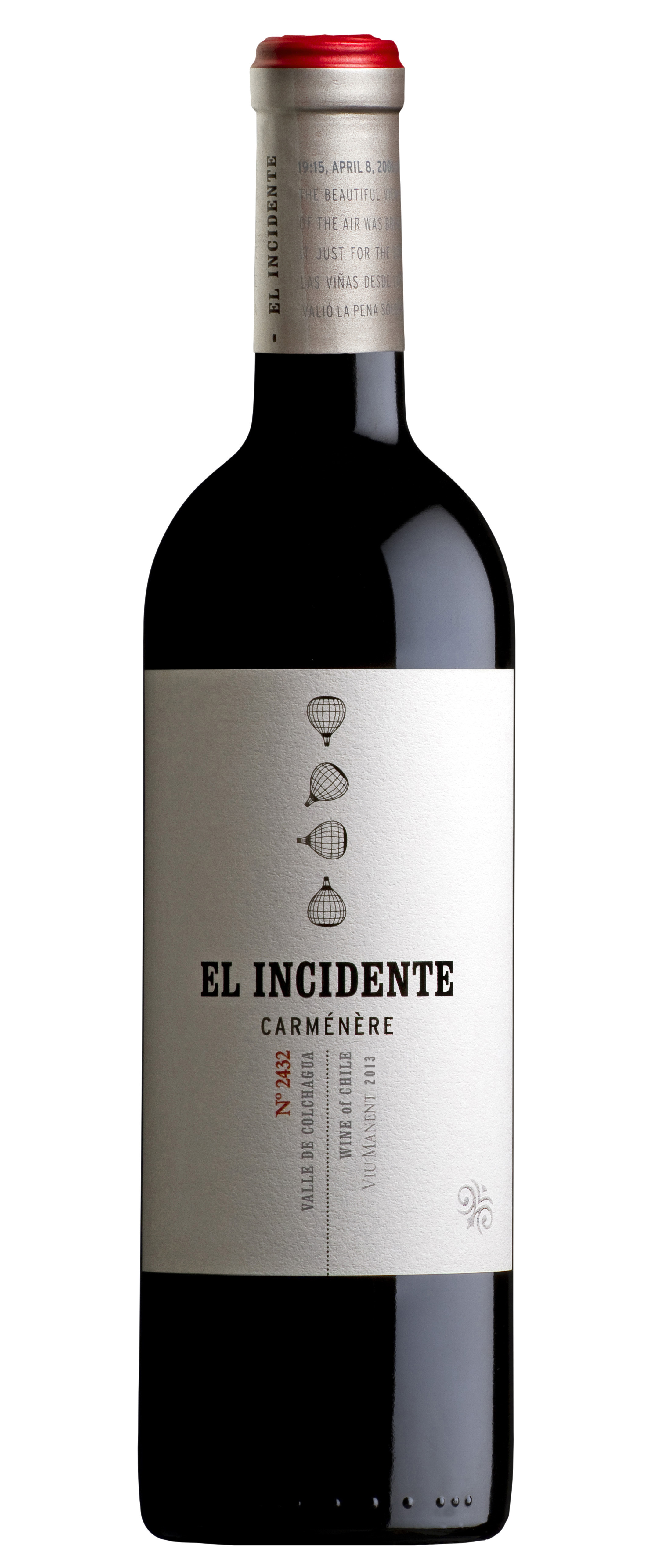 Y El Incidente, que rememora el mítico viaje en globo que realizó José Miguel Viu junto a un grupo de amigos, donde sobrevolaron sus viñedos en Colchagua, y la aventura terminó inesperadamente cuando el Globo cayó en un mercado al aire libre en el pueblo de Santa Cruz. Experiencia a partir de la cual se dio vida a este Carménère, cepa emblemática de Chile. El Incidente es un vino de intenso color violeta, con aromas a frutos negros, pimienta negra, cuero y tabaco rubio. En boca es de gran complejidad y estructura, con taninos sedosos y tisosos -propios del terroir de La Capilla- que dan paso a un final profundo y persistente.